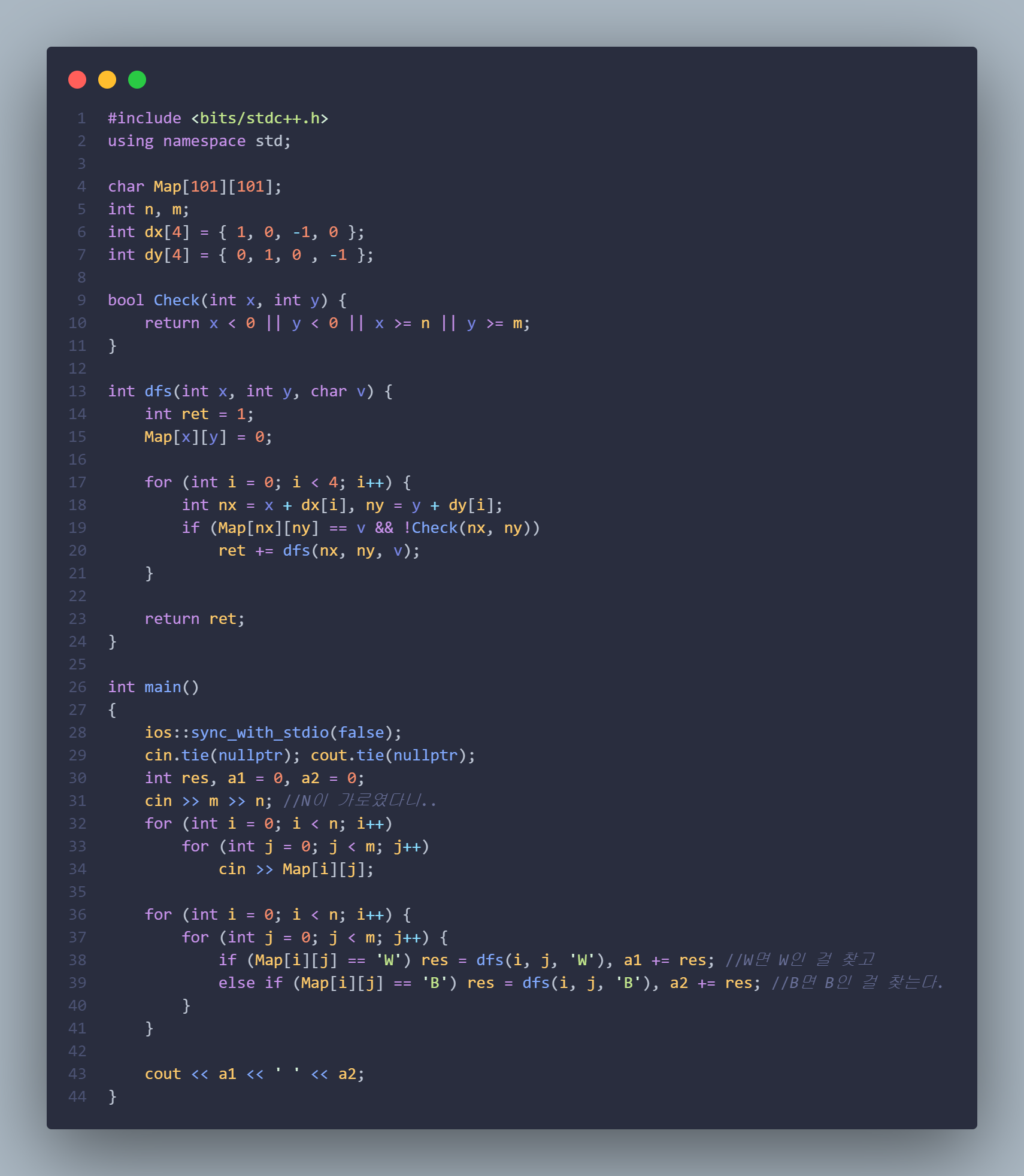 이 문제는 간단한 그래프 탐색 문제다. 나는 가벼운 마음을 갖고 DFS로 풀었는데 생각보다 쉽지 않았다. 그래서 수많은 시행착오 후에 알게 됐는데, M이 가로가 아니라 N이 가로였다. 나는 그래프 문제 풀 때 항상 M을 가로로 했는데 선입견에 의해 틀린 것이었다. 그래도 풀고 나니 후련하다. #include using namespace std; char Map[101][101]; int n, m; int dx[4] = { 1, 0, -1, 0 }; int dy[4] = { 0, 1, 0 , -1 }; bool Check(int x, int y) { return x = n || y >= m; } int dfs(int x, int y, char v) { int ret = 1..